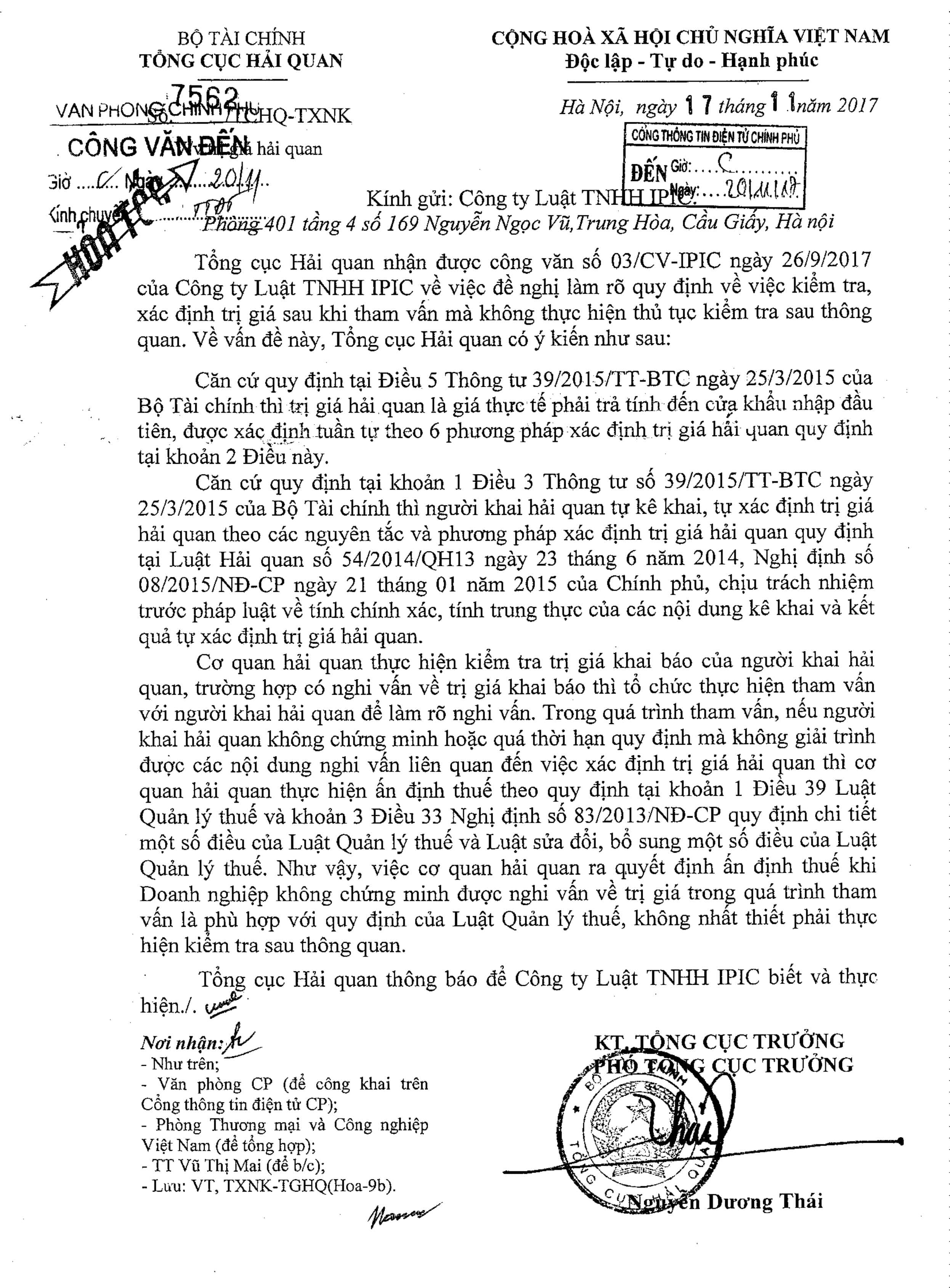 Bằng công văn này, Công ty IPIC kính mong sớm nhận được trả lời từ Quý Bộ hướng dẫn và làm rõ g.2.2, Điểm g.2, Khoản 3, Điều 25 Thông tư 38/2015/TT-BTC quy định về kiểm tra trị giá hải quan, xác định việc ra quyết định ấn thuế sau khi tham vấn giá mà không thực hiện thủ tục kiểm tra sau thông quan có đúng không và theo căn cứ pháp luật nào.