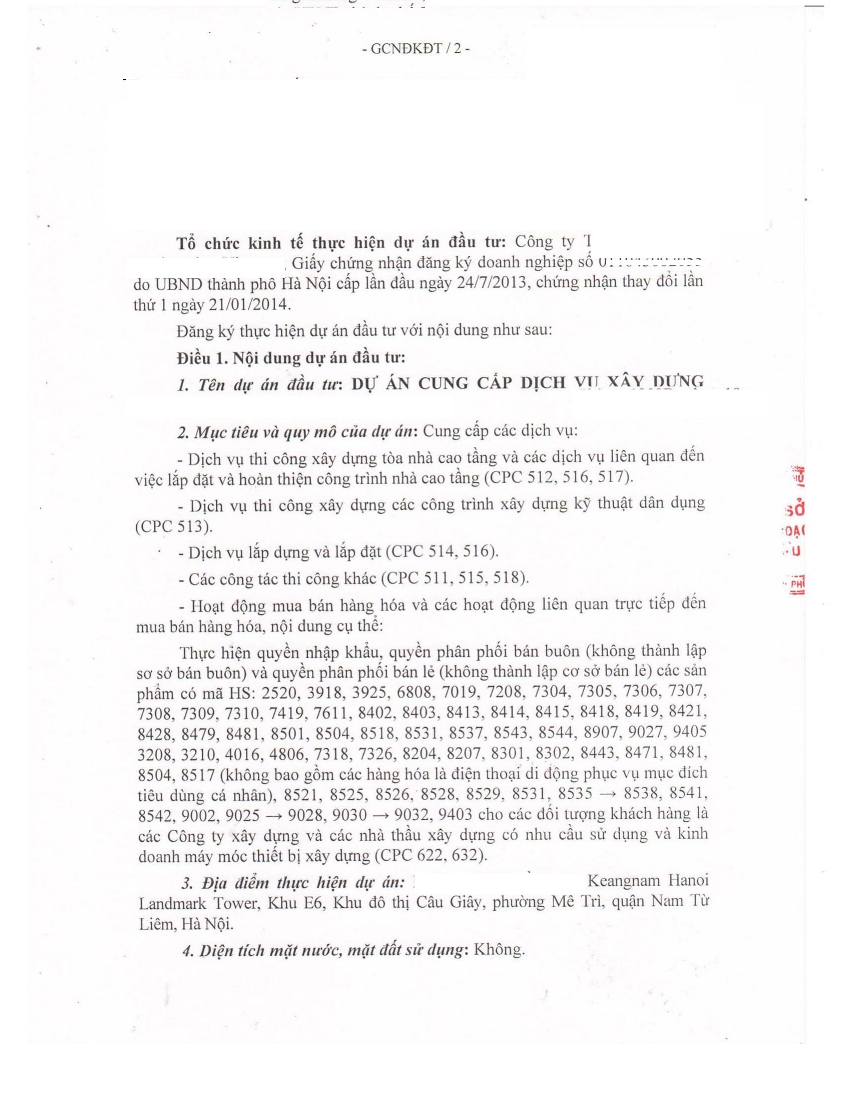 Ngày 25 tháng 10 năm 2016 Công ty Luật IPIC đã tư vấn thành công cấp giấy chứng nhận đăng ký đầu tư cho dự án cung cấp dịch vụ xây dựng. Cụ thể là dịch vụ thi công xây dựng tòa nhà cao tầng và các dịch vụ liên quan đến việc lắp đặt và hoàn thiện công trình tòa nhà cao tầng; hoạt động mua, bán hàng hóa, thực hiện quyền nhập khẩu, quyền phân phối bán buôn , bán lẻ các sản phẩm liên quan đến máy móc thiết bị xây dựng.