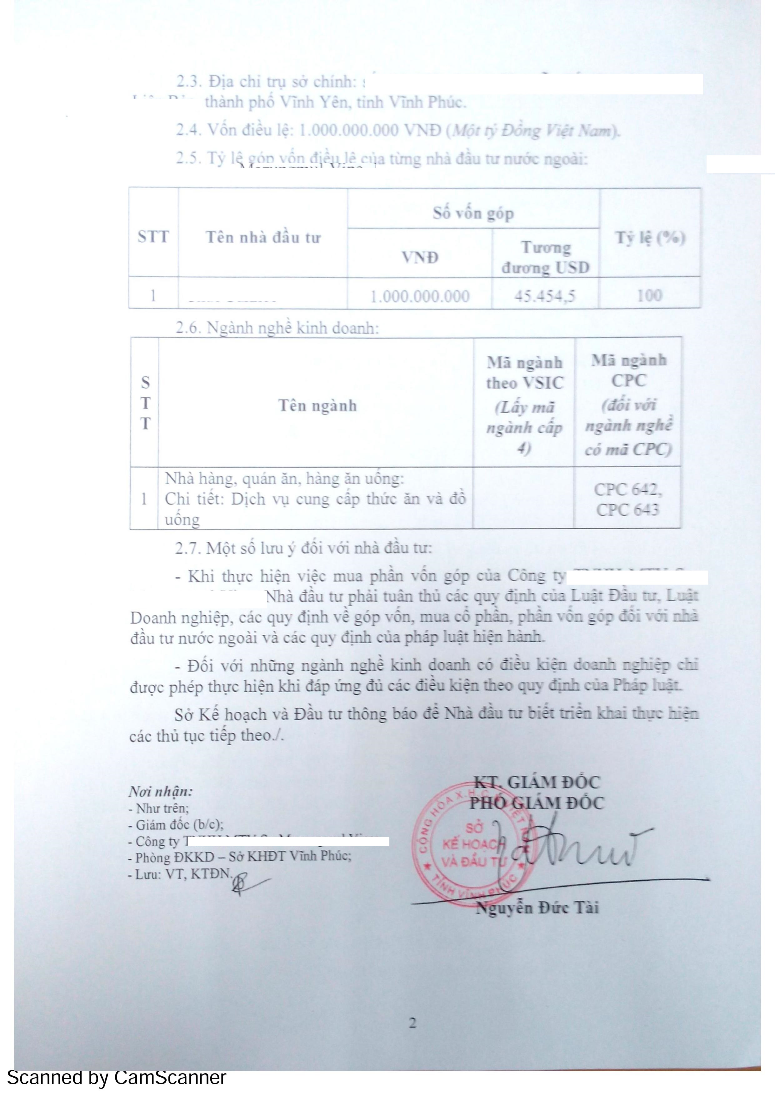 Ngày 24 tháng 10 năm 2016 Công ty Luật IPIC đã tiến hành tư vấn và thực hiện dịch vụ cấp phép hoạt động nhà hàng có vốn đầu tư nước ngoài. Nhà hàng có trụ sở chính tại thành phố Vĩnh Yên, tỉnh Vĩnh Phúc. Đây là một trung tâm kinh tế trọng điểm, là đầu mối giao thông quan trọng của vùng kinh tế trọng điểm Bắc Bộ, đây cũng là một trong những thành phố cấp tỉnh có diện mạo thay đổi nhanh nhất của miền Bắc. Là thành phố có nhiều công trình mang những điểm nhấn rất riêng.