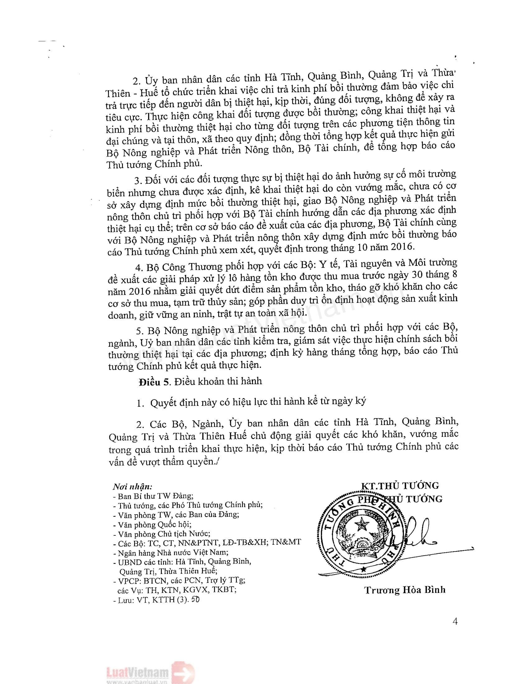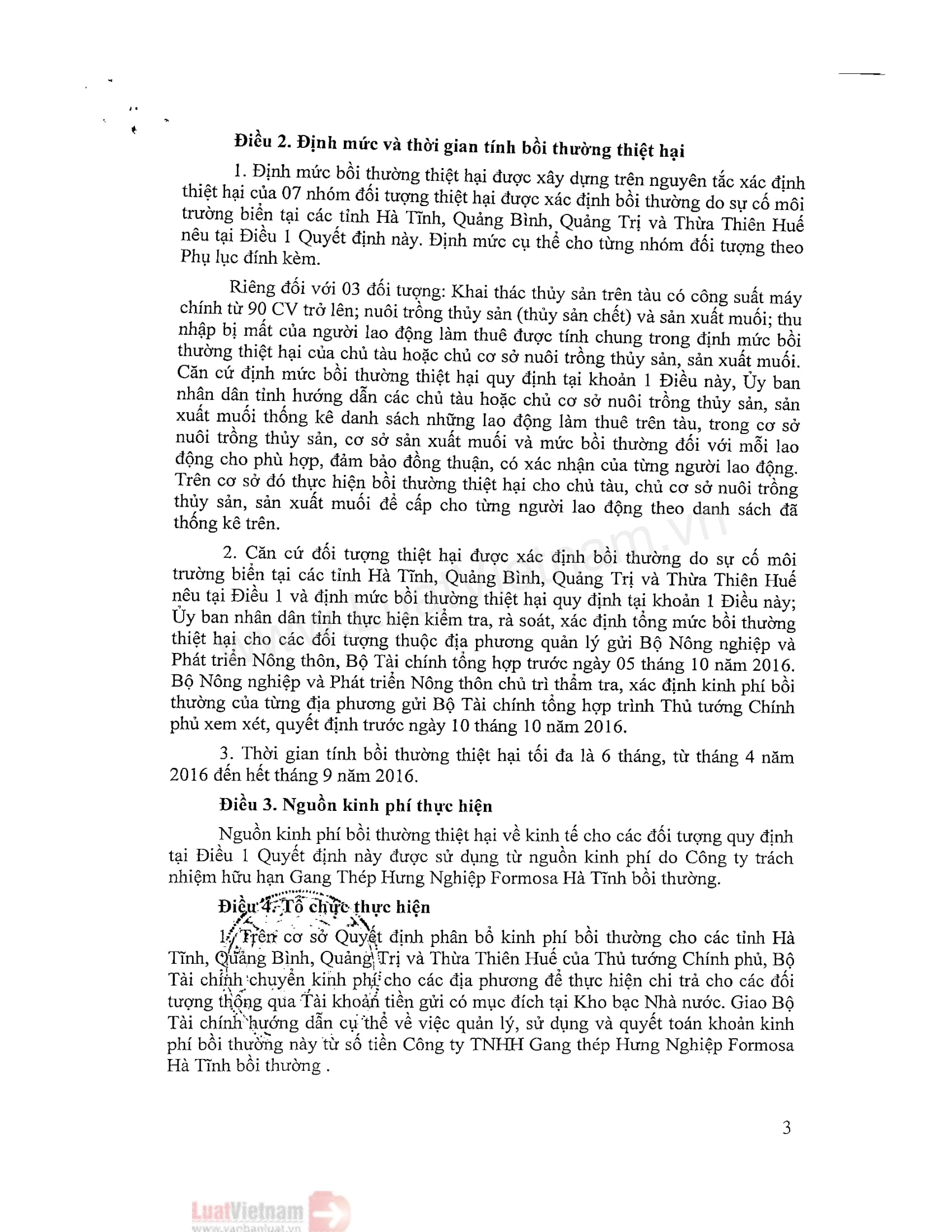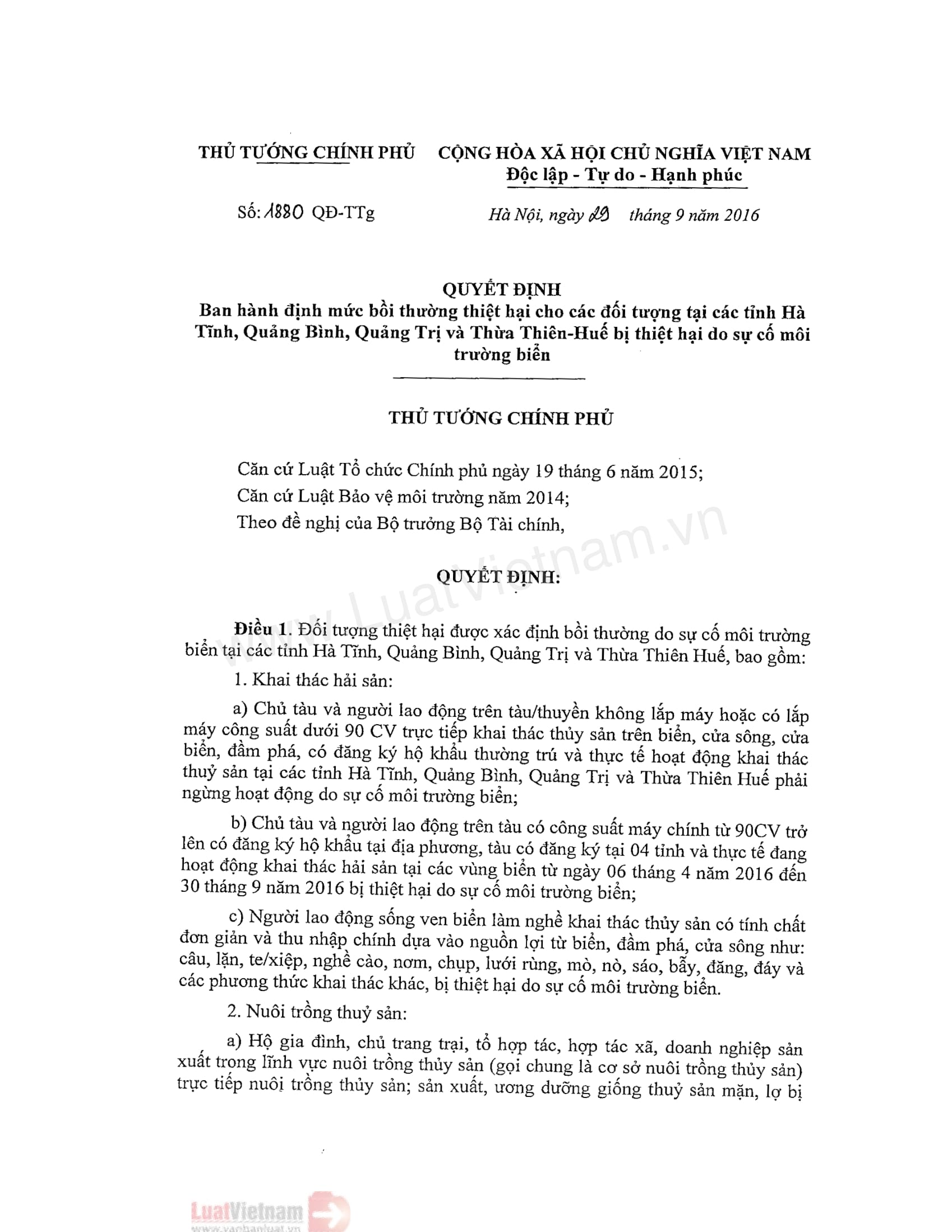 Ngày 29 tháng 9 năm 2016 Thủ tướng Chính Phủ đã ký ban hành Quyết định 1880/QĐ-TTg quy định về đối tượng và định mức bồi thường thiệt hại tại các tỉnh Hà Tĩnh, Quảng Bình, Quảng Trị và Thừa Thiên-Huế bị thiệt hại do sự cố môi trường biển liên quan vụ xã thải của công ty Formosa. Trong đó quy định có 7 loại đối tượng được bồi thường thiệt hại gồm 1 Khai thác hải sản bao gồm chủ tàu và người lao động, 2 Người nuôi trồng thủy sản gồm người lao động, 3 Người sản xuất muối bao gồm người lao động, 4 Tổ chức hoạt động kinh doanh hải sản ven biển bao gồm người lao động, 5 Dịch vụ hậu cần nghề cá, 6 Dịch vụ thương mại du lịch ven biển, 7 Thu mua tạm trữ thủy sản.