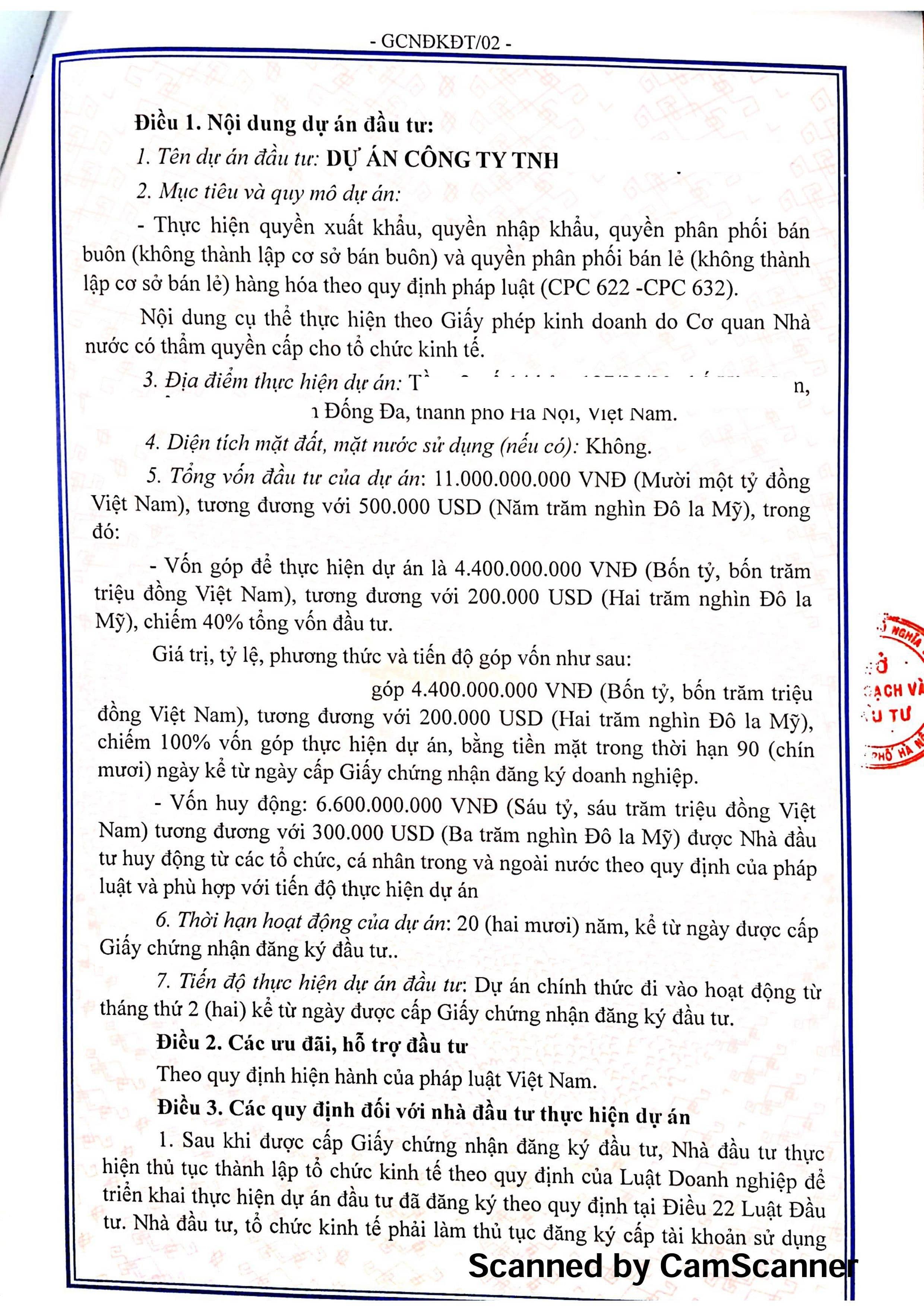 Việc cấp giấy chứng nhận đăng ký đầu tư thành lập công ty 100% vốn nước ngoài dự án thực hiện quyền xuất khẩu, nhập khẩu, quyền phân phối bán buôn, bán lẻ nói trên một lần nữa khẳng định chất lượng dịch vụ của công ty luật IPIC, đồng thời chúng tôi rất cảm ơn vì sự hợp tác của Sở Kế hoạch và Đầu tư thành phố Hà Nội trong suốt quá trình thực hiện đăng ký dự án.